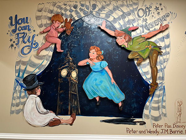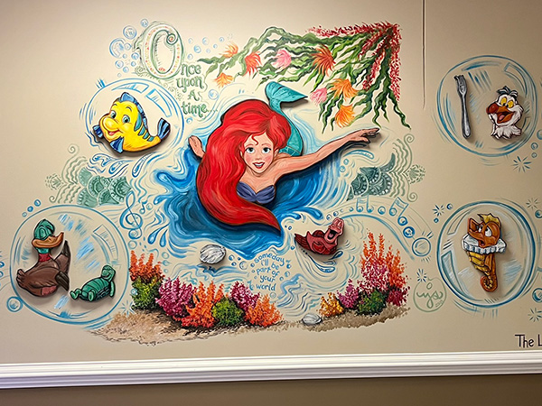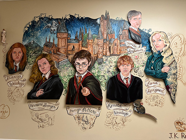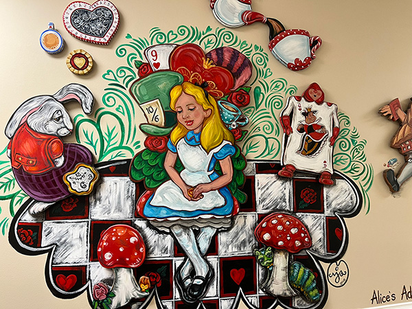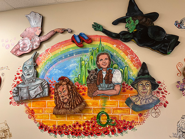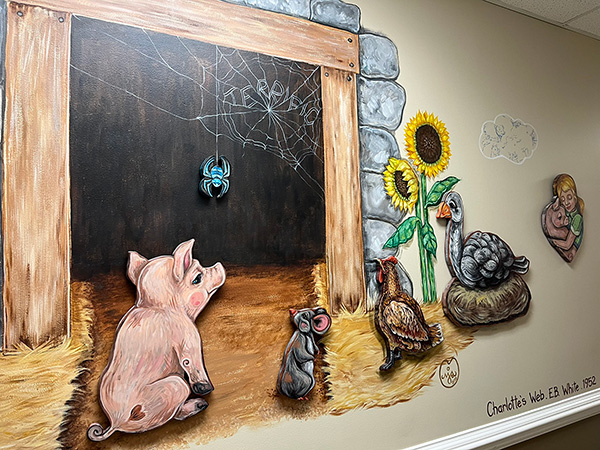 Our building is cheerful and welcoming with beautiful artwork covering all of the walls. Each room contains unique murals by a local artist that highlights scenes or characters from famous children’s books.